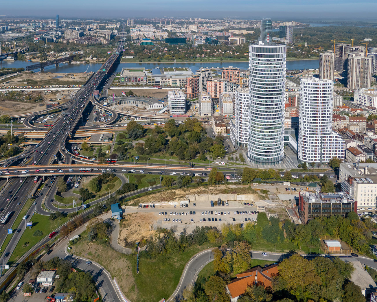 Today's appearance of the Mostar interchange and the highway with the "Skyline" complex as a modern gateway to Kneza Miloša Street.