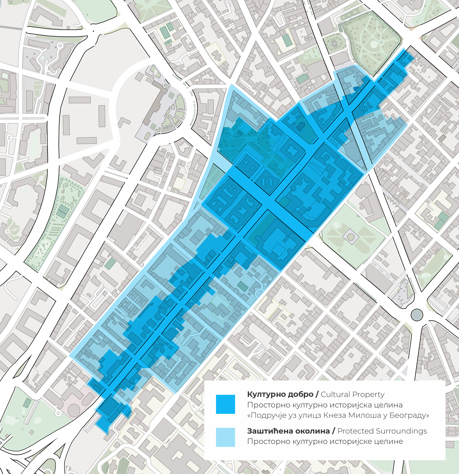 Нису сва места постала метрополе, само зато што у њима живи пуно људи. Уређење града је неминовно увезано са уређењем самог друштва, а Београд је будио у људима идеје за велике циљеве. Да ли те идеје доноси вода која долази и са севера и са запада, а води до истока и југа, или су то ветрови који су га са свих страна света рушили вековима. Улица кнеза Милоша је сведок тих великих идеја и веза са коренима жеље да Београд стоји уз велике градове Европе. Подручје уз Улицу кнеза Милоша у Београду утврђено је 2020. године за културно добро – просторну културно-историјску целину (Одлука о утврђивању, Сл. гласник РС,бр. 159/20).