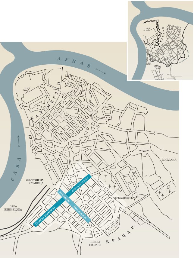 The area covered by the plan created by Franz Janke and the positions of Kneza Miloša and Nemanjina Streets.