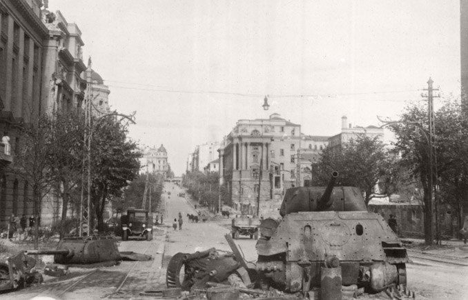 Tanks and trucks in Kneza Miloša Street, destroyed during the fighting for the liberation of the city, Belgrade, October 20, 1944.