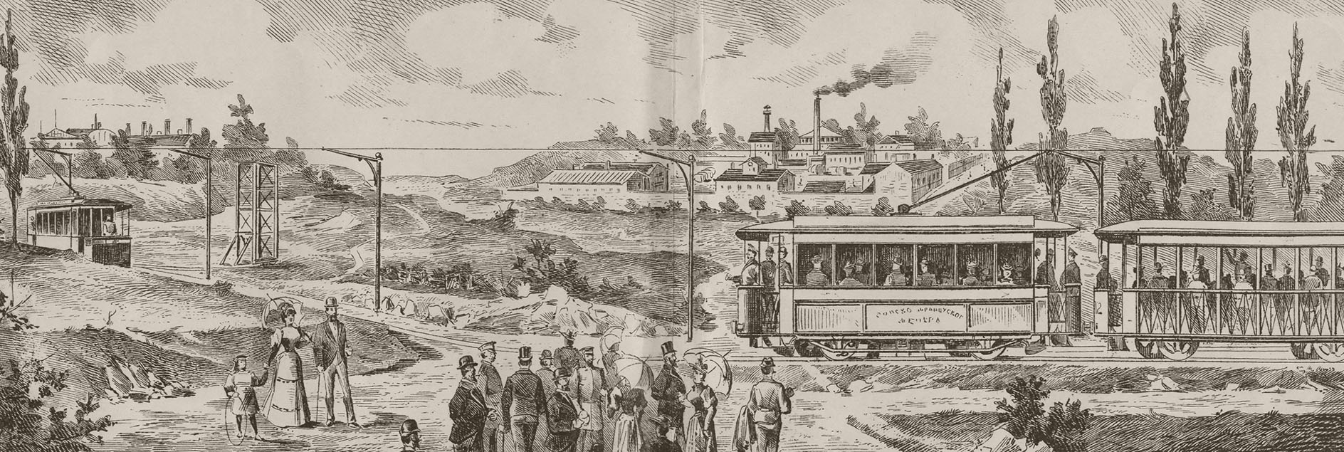 Electric tram in front of Weifert’s Brewery in 1895 (today interchange Mostar) lithograph by Pet. M. Marković