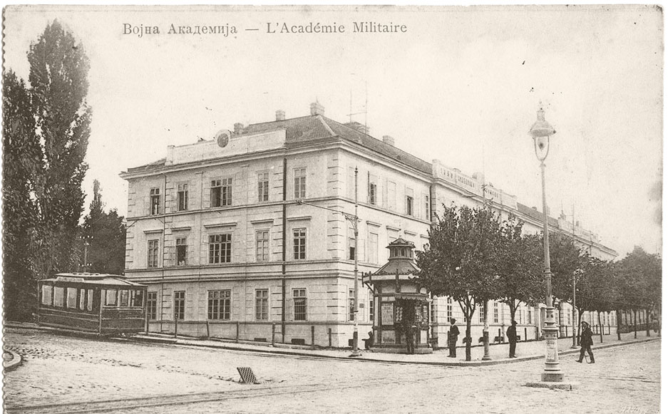 The old Military Academy building, constructed in 1850 based on a design by Czech architect Jan Nevole, originally housed the Artillery School. Located at the corner of Nemanjina and Miloša Velikog Streets, it was demolished after World War II.